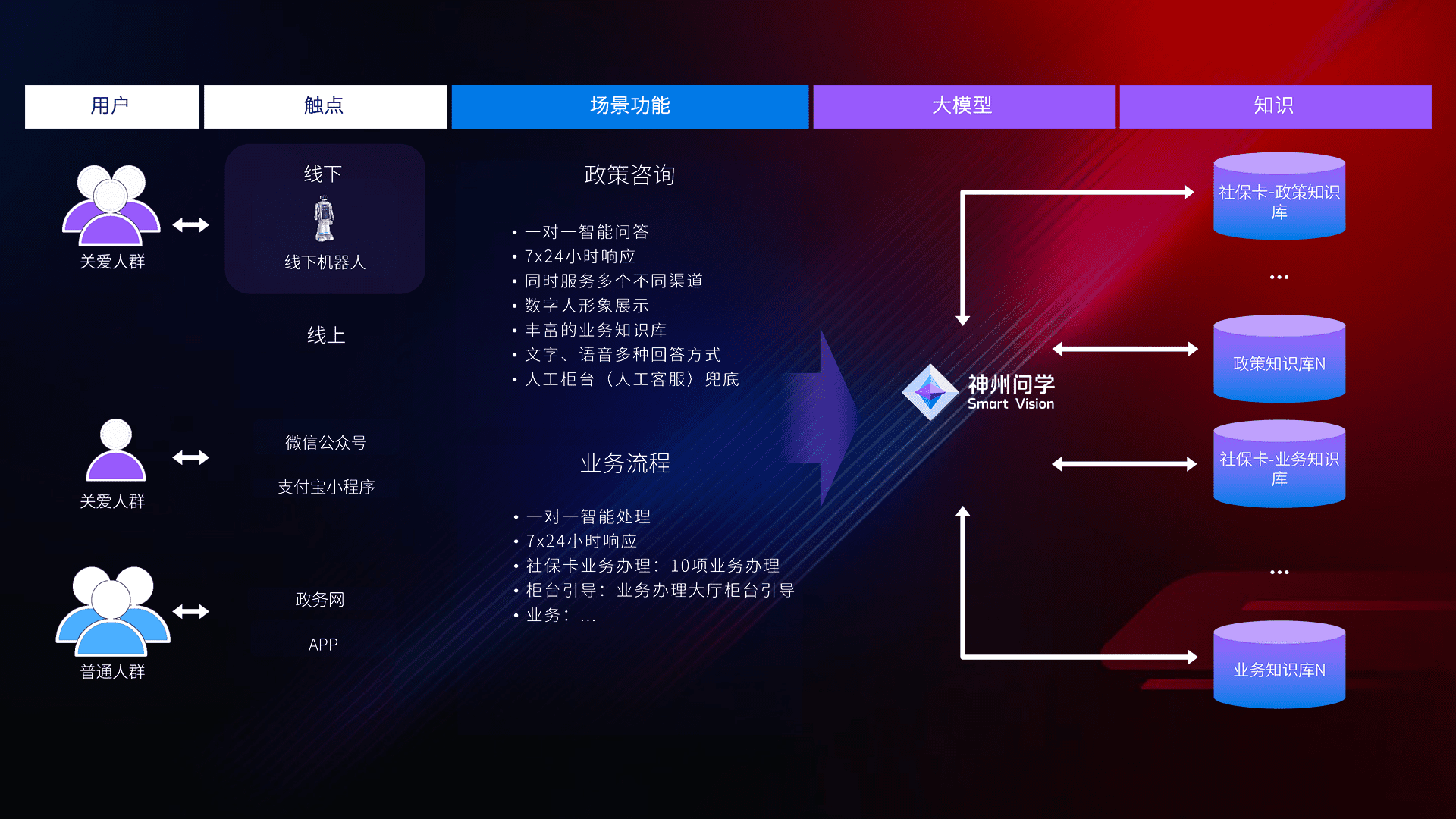 • 线上线下全覆盖:线上提供微信公众号、、、支付宝小程序、、、政务网、、、app多种渠道,,,与线下机器人形成完整服务体系。。